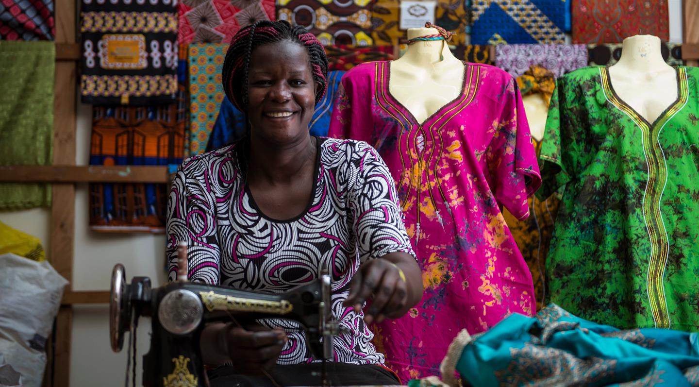 Aber Santolini, ondernemer en lid van een spaargroep, in haar atelier in de markt van Gulu, Uganda.